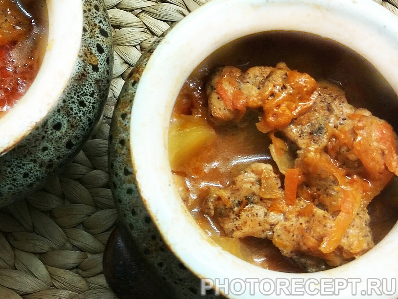 Покрываем майонезом или сметаной (можно смешать и то и другое), заливаем водой, накрываем крышкой. Отправляем мясо с картошкой в духовку. Время приготовления жаркого в горшочках около 1 часа 20 минут при температуре выпекания 180 градусов. Все зависит от вашей духовки.